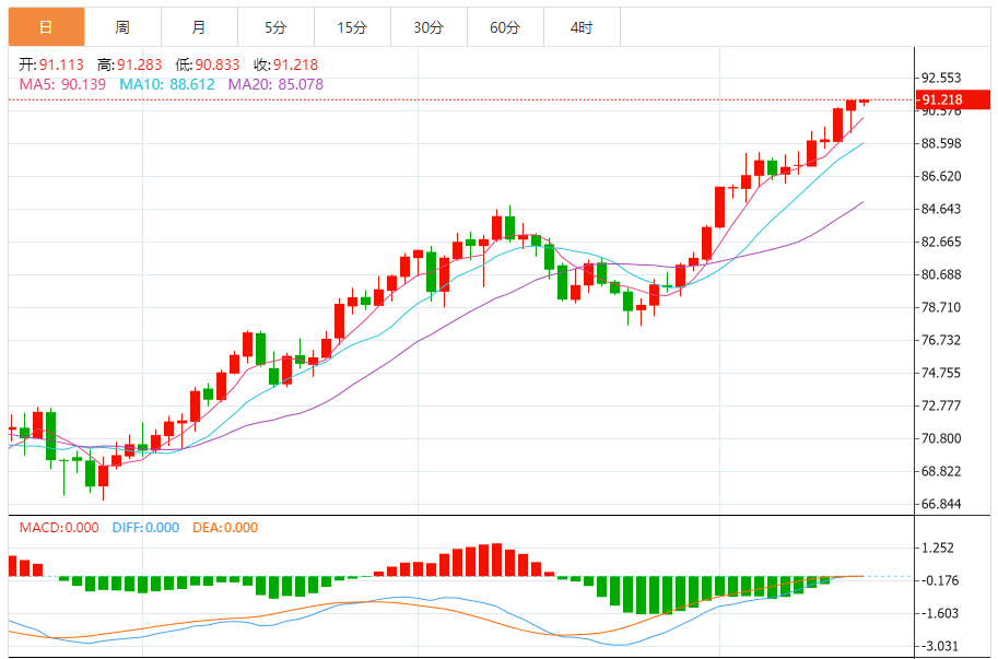 基本消息面 周一(9月18日),美原油低开高走,目前交投于91附近。 相关新闻消息 上周早些时候,国际能源署(ItratioalrgyAgcy)警告称,石油市场正处于供应短缺状态,并将在第四季度进一步加剧。原因是沙特和俄罗斯的减产协议刚刚延长至今年年底。通胀数据表明,当