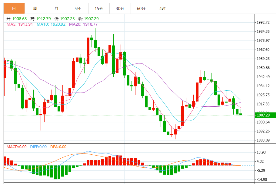 周四(9月14日),现货黄金短线突然快速下滑,金价目前回落至1908美元/盎司附近。 黄金市场基本面分析 金价周三延续跌势,并触及三周新低1905.52美元/盎司。金价目前可能还将继续下滑,并测试1900美元/盎司关口。 目前投资者焦点转移到欧洲央行定于周四晚些时候的利率决议。