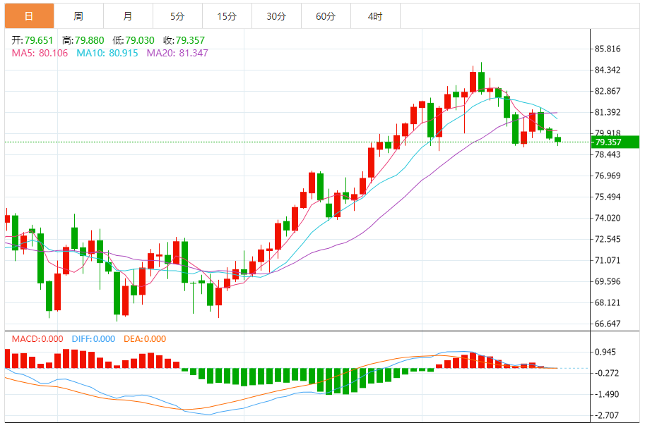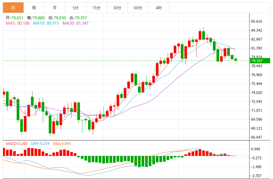 基本消息面 北京时间24日凌晨,美国WTI原油期货周三收跌,并创一个月来的最低收盘价。 分析师称,尽管目前原油市场略显供应不足,但对未来原油需求前景的担忧情绪仍令油价承压。 周三,纽约商品交易所10月交割的西德州中质原油(WTI)期货价格下跌75美分,跌幅为0.9%,收于每桶78.89美元,创7月26