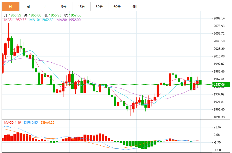基本消息面 周二(8月1日),现货黄金震荡微跌,目前交投于1959.20美元/盎司附近,因为预计美国经济数据将维持强劲,市场对美联储11月份再加息一次的预期有所回升,美元指数持坚于近三周高位附近,令金价承压。短线来讲,金价后市仍有一定的下行风险,可能会下探布林线下轨1943.76附近支撑。 相关新闻消
