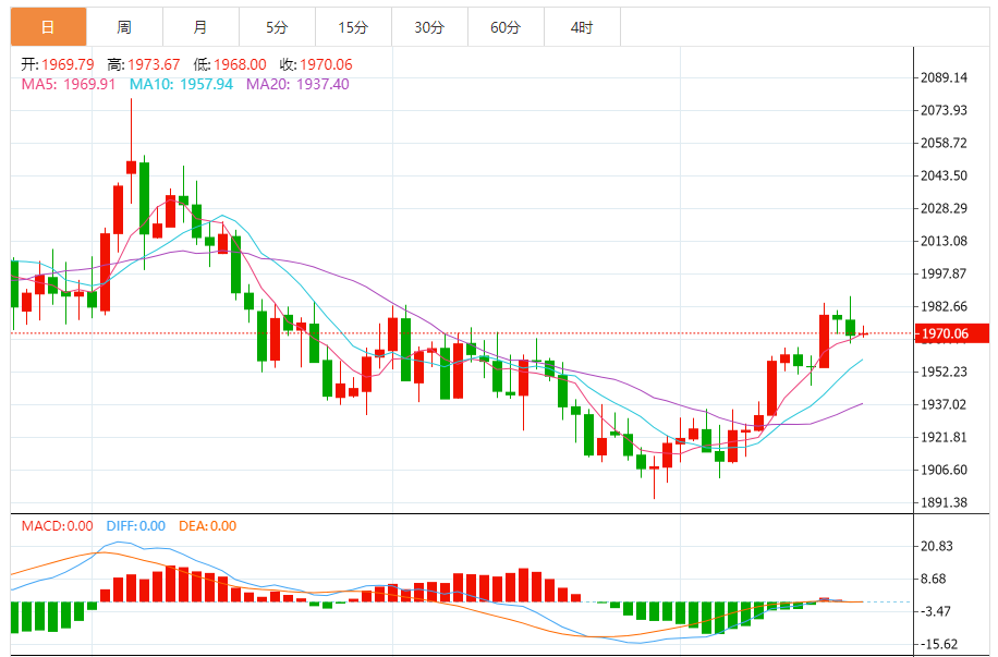 基本消息面 周五(7月21日),现货黄金窄幅震荡,目前交投于1969.84美元/盎司附近,日内无重要经济数据和风险事件,市场交投比较谨慎,多数投资者已经开始等待下周的美联储利率决议。 相关新闻消息 由于隔夜出炉的美国初请失业金人数低于市场预期,美元指数反弹至一周高位,短线看涨信号增加,对金