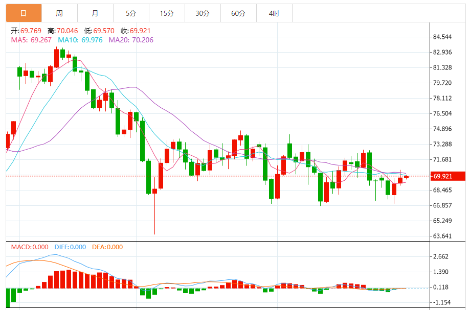 基本消息面 周五(6月30日),美原油窄幅震荡,目前交投于69.75美元/桶附近,IA原油库存降幅大于预期,美国经济数据强于预期,改善需求预期,给油价提供支撑,但担心利率上升可能影响全球经济增长,令多头有所顾忌,而且本周美元指数震荡反弹至逾两周高位,也限制油价涨势。 相关新闻消息 OKFia