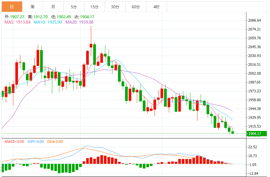 基本消息面 周四(6月29日),现货黄金维持日内跌势,金价目前交投在1904美元/盎司附近。 根据cooi.co,金价已经确认攻克首个看空目标1913.15美元/盎司,这为金价进一步大跌铺平道路。 相关新闻消息 受美元走强打压,现货黄金周三收报1907.32美元/盎司,下跌6.21美元或0.32%,盘中最低触