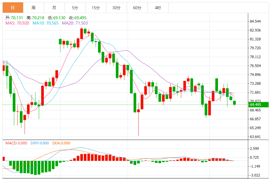 基本消息面 周一(6月12日),美原油震荡走弱,目前交投于69.33美元/桶附近,对中国燃料需求增长和俄罗斯原油供应上升的担忧打压市场,而且在夏日需求高峰期,美国成品油库存的大幅增加,也暗示需求不佳,共同拖累油价,短线略微偏向空头。 相关新闻消息 本交易日主要留意中国5月2等金融数据,关