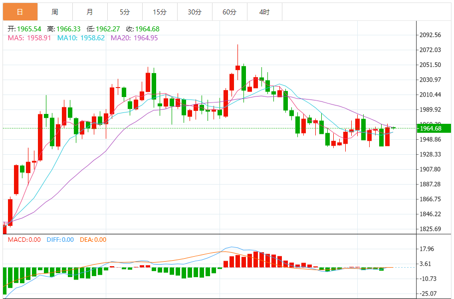 基本消息面 周五(6月9日),现货黄金窄幅震荡,目前交投于1964.36美元/盎司附近,隔夜美国初请数据表现很差,美元大跌,帮助金价上涨,虽然短线看涨信号有所增加,但在下周美联储利率决议前,市场观望情绪渐浓,多头仍有所顾忌,金价仍处于近三周的震荡区间内。 相关新闻消息 目前市场普遍预计美