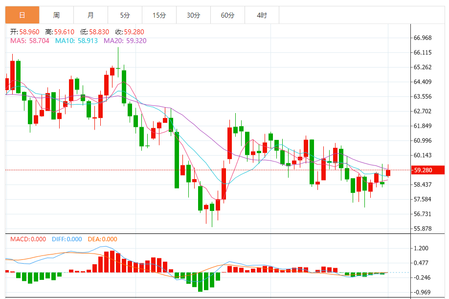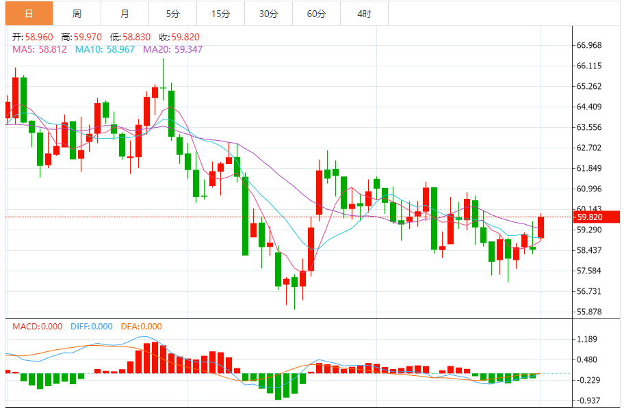 周一(12月1日),美原油价格交投于59.830美元/桶附近,涨幅为2.19%。 原油在最近的盘中交易中上涨,此前它成功地迅速回补早期的跌幅,并转为盘中涨幅,受益于对A50支撑位的依赖,同时受到短期内退出小幅下跌通道的影响,这为其收盘和反弹提供了额外的推动力。 在相对强弱指标消化了超买