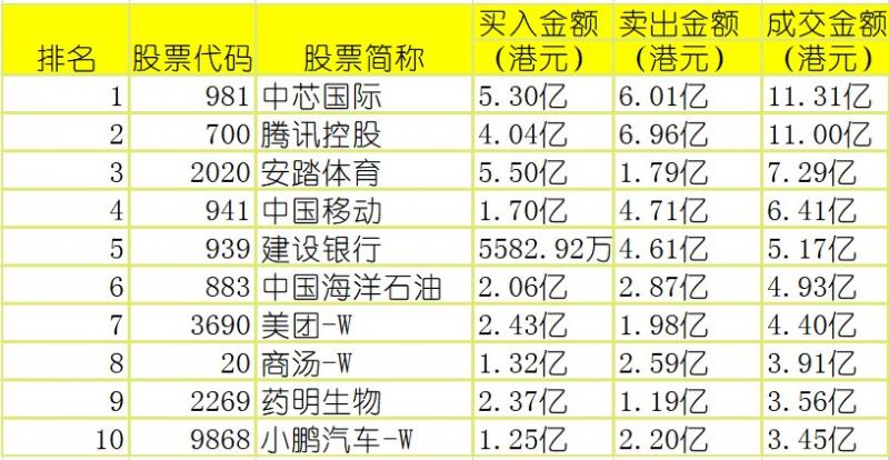 亚汇网实时数据统计:截至4月18收盘,中芯国际、腾讯控股、安踏体育(沪)成交前三,腾讯控股、中芯国际、安踏体育(深)成交前三。 港股通(沪)买卖前十股(单位:港元): 港股通(沪)买卖前十股(单位:港元): (亚汇网编辑:雪晴)