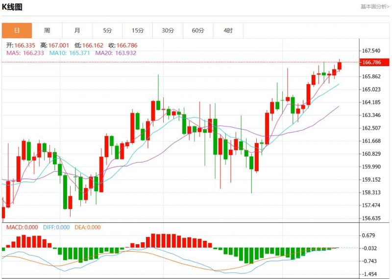 今日周二,英镑兑日元报166.819,涨幅0.28%。 今日分析:看涨,当166.34为支撑位。 备选策略:如跌破166.34,G/JY目标方向定在165.73和165.36。 技术点评:RI技术指标超过50。ACD技术指标处在其信号线之上看多。此外,价位高于其20天及50天移动平均线(分别位于166.55和1