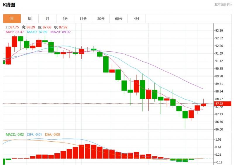 澳元兑日元报87.91,涨幅0.13% 交易策略:逐渐下跌,当88.30阻碍上行,则87.30为目标位。 备选策略:向上突破88.30,将带来继续上行的趋势,目标位定在88.65和88.87。 技术点评:RI技术指标小于中性区域50。ACD技术指标呈现看多状态并处在其信号线的