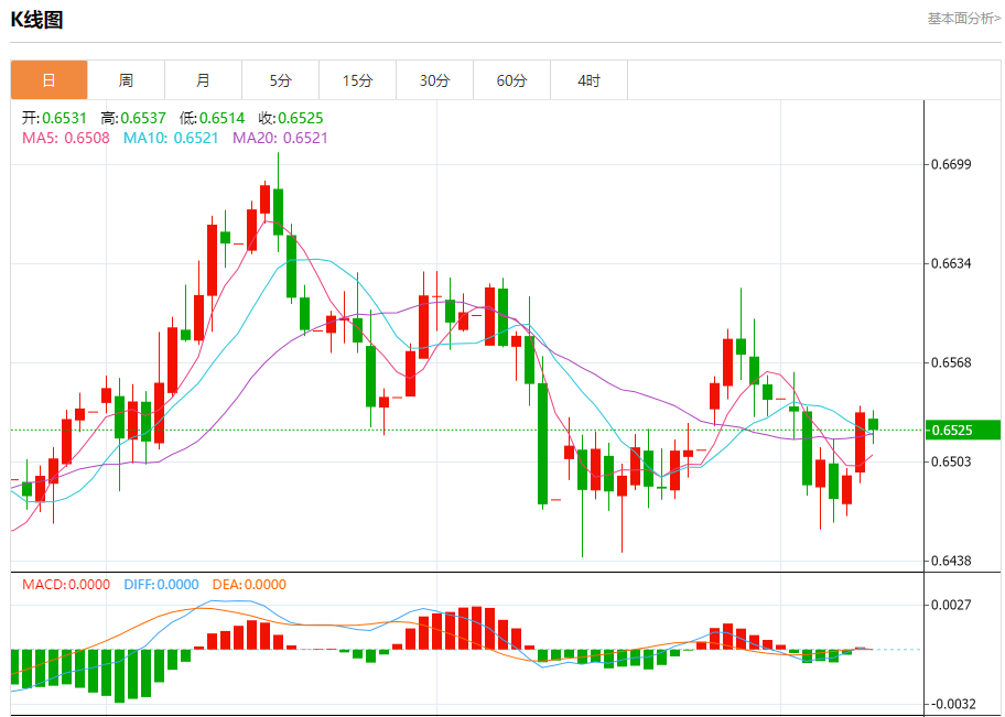 今日周二,澳元兑美元报0.6525,跌幅0.17%;美元兑加元报1.4031,涨幅0.06%;美元兑瑞郎报0.8019,跌幅0.40%。 澳元兑美元汇率分析 技术点评:只要依旧存在0.6540阻力位,价格波动存在看跌的趋势。 阻力位:0.65750.65600.6540 支撑位:0.65000.64850.6470