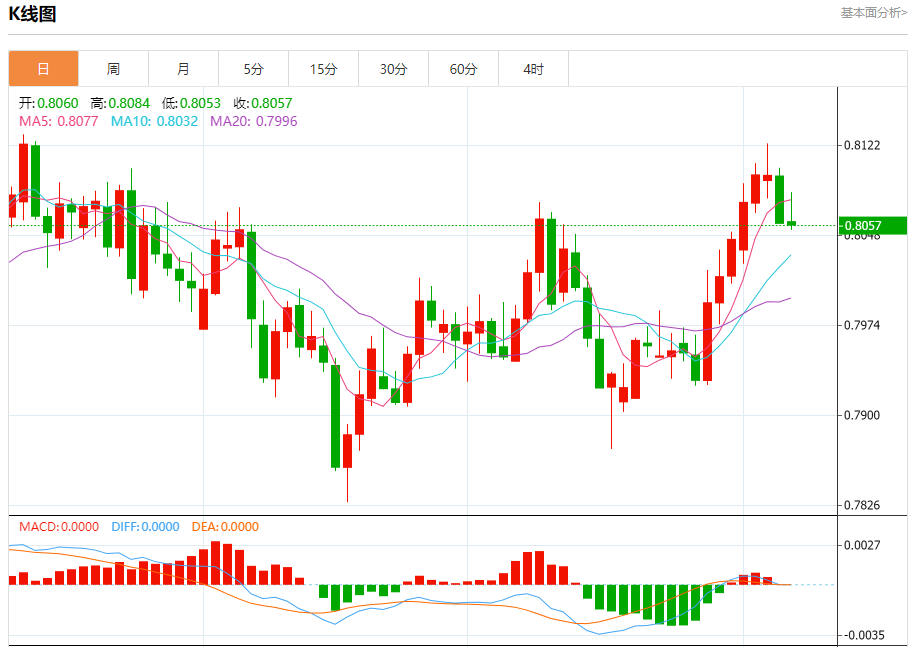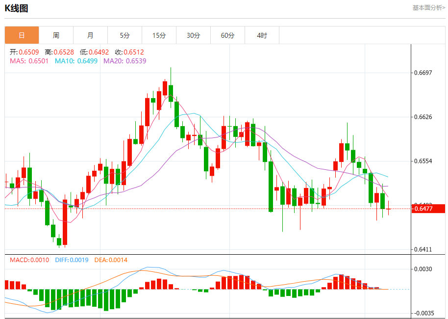 今日周五,澳元兑美元报0.6479,涨幅0.01%;美元兑加元报1.4115,跌幅0.02%;美元兑瑞郎报0.8059,跌幅0.02%。 澳元兑美元汇率分析 技术点评:只要依旧存在0.6500阻力位,很可能下跌至0.6460。 阻力位:0.65350.65200.6500 支撑位:0.64600.64400.6420