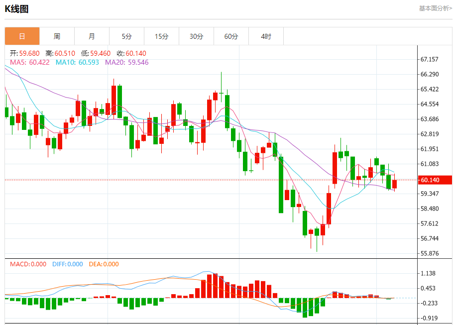 周四盘中,WTI原油报60.040,涨幅0.76%。 今日分析:在59.70之上,看涨,目标价位为60.70,然后为61.07。 技术点评:即使我们不能排除持续调整的可能性,其时间长度上,应该是有限的。 支撑位:59.7059.4559.20 阻力位:61.4761.0760.70 (亚汇网
