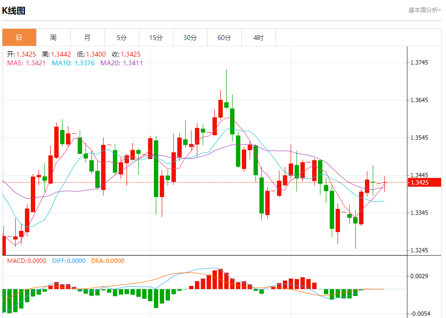 周一盘中,英镑/美元报1.3425,涨幅0.02%。 今日分析:在1.3450之下,看跌,目标价位为1.3405,然后为1.3390。 技术点评:RI技术指标看跌,有进一步向下趋势。 支撑位:1.34051.33901.3370 阻力位:1.34901.34701.3450 (亚汇网编辑:冰凡)