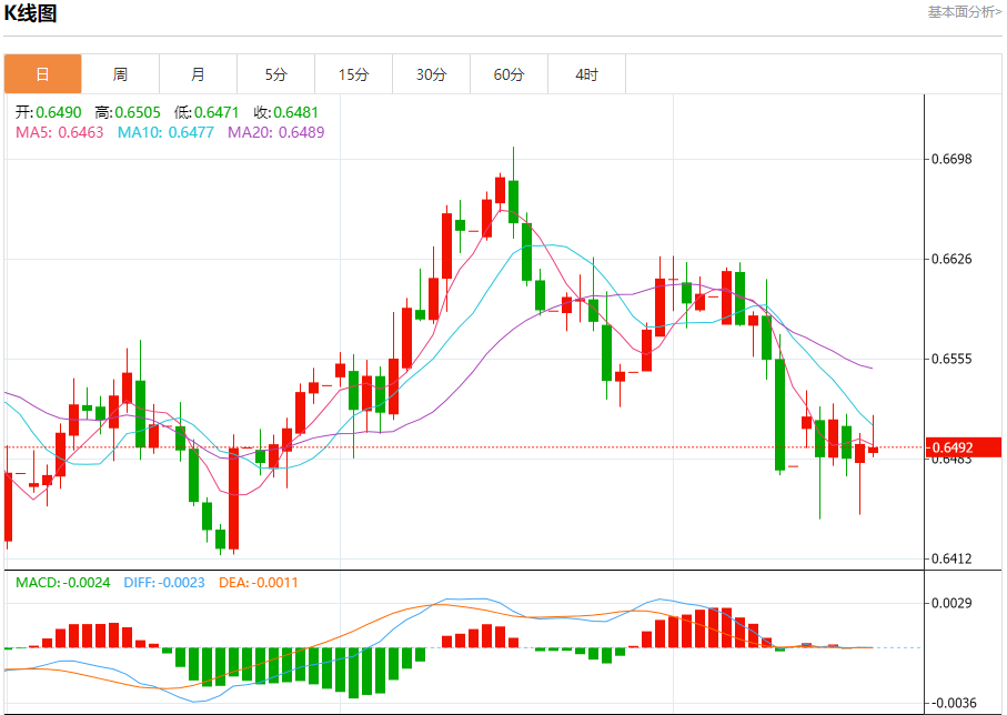 今日周一,澳元兑美元报0.6492,跌幅0.03%;美元兑加元报1.4051,涨幅0.22%;美元兑瑞郎报0.7924,跌幅0.15%。 澳元兑美元汇率分析 技术点评:只要依旧存在0.6510阻力位,价格波动存在看跌的趋势。 阻力位:0.65400.65250.6510 支撑位:0.64800.64600.6445