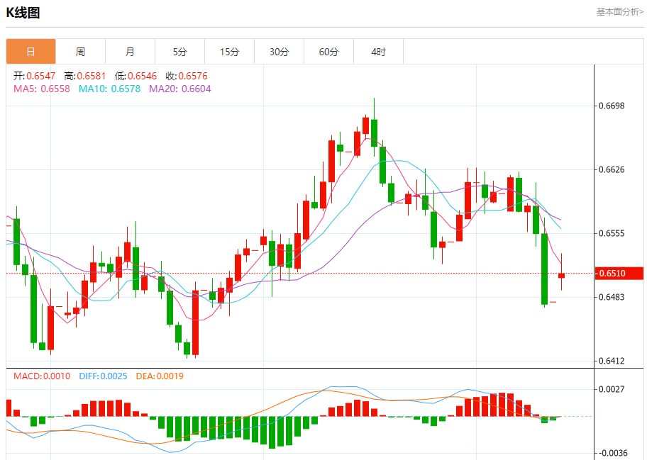 今日周一,澳元兑美元报0.6511,涨幅0.50%;美元兑加元报1.4018,涨幅0.14%;美元兑瑞郎报0.8047,涨幅0.58%。 澳元兑美元汇率分析 技术点评:上升的空间可能被0.6535阻力位所限制。 阻力位:0.65750.65550.6535 支撑位:0.64700.64500.6430 美元