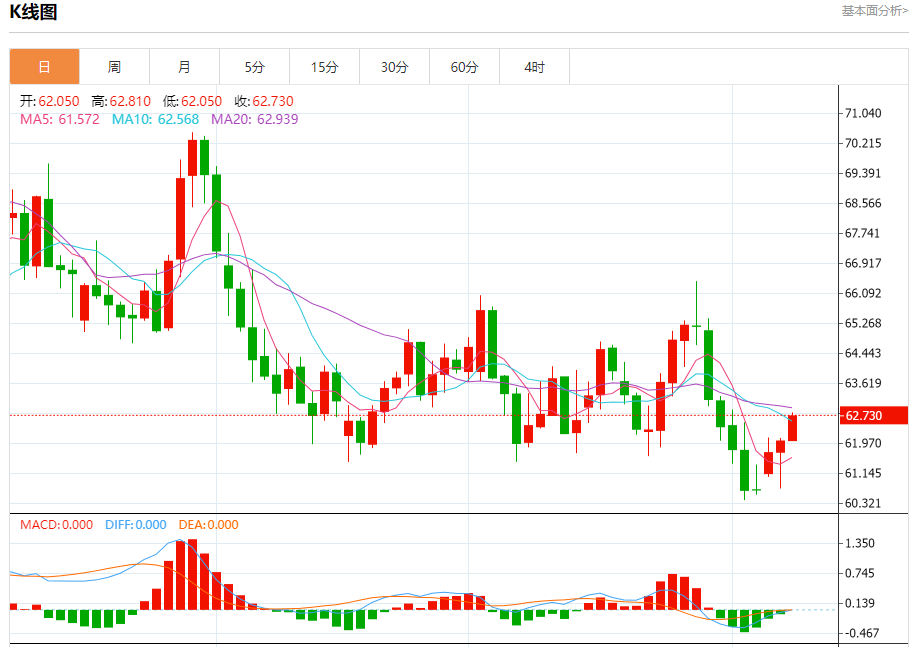 周三盘中,WTI原油报62.780,涨幅1.70%。 今日分析:在61.70之上,看涨,目标价位为62.80,然后为63.20。 技术点评:RI技术指标上,呈现上升趋势。 支撑位:61.7061.2060.70 阻力位:63.5063.2062.80 (亚汇网编辑:冰凡)