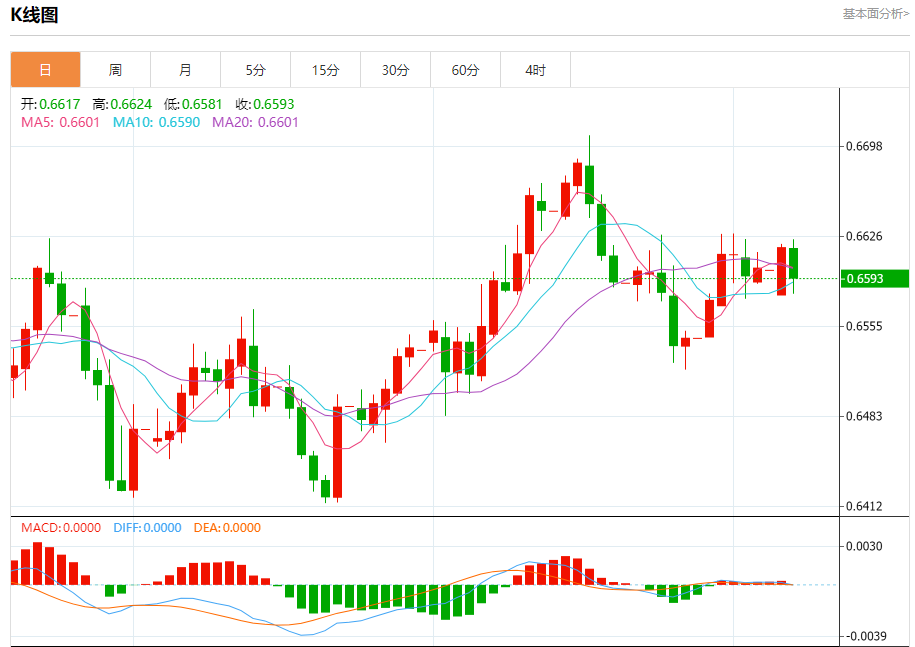 今日周二,澳元兑美元报0.6594,跌幅0.38%;美元兑加元报1.3950,涨幅0.05%;美元兑瑞郎报0.7979,涨幅0.37%。 澳元兑美元汇率分析 技术点评:RI技术指标看跌,有进一步向下趋势。 阻力位:0.66300.66200.6610 支撑位:0.65800.65650.6550 美元兑