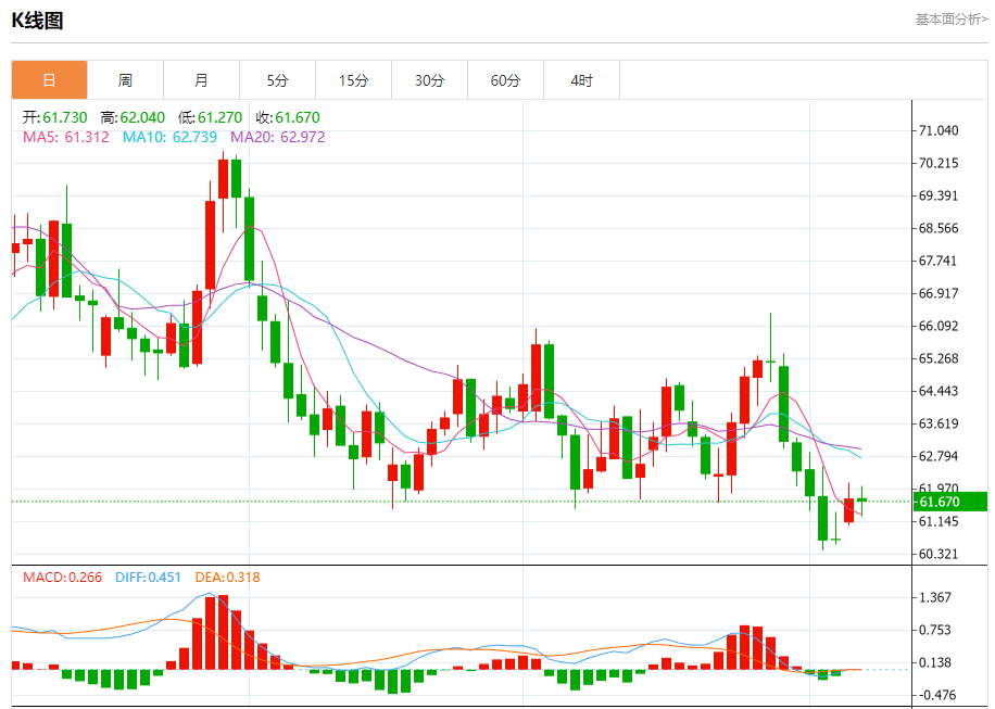 周二盘中,WTI原油报61.530,跌幅0.26%。 今日分析:在61.20之上,看涨,目标价位为62.20,然后为62.80。 技术点评:超短线(当日内)技术指标运行趋势复杂,应谨慎操作。 支撑位:61.2060.7060.40 阻力位:63.4062.8062.20 (亚汇网编辑:冰凡)