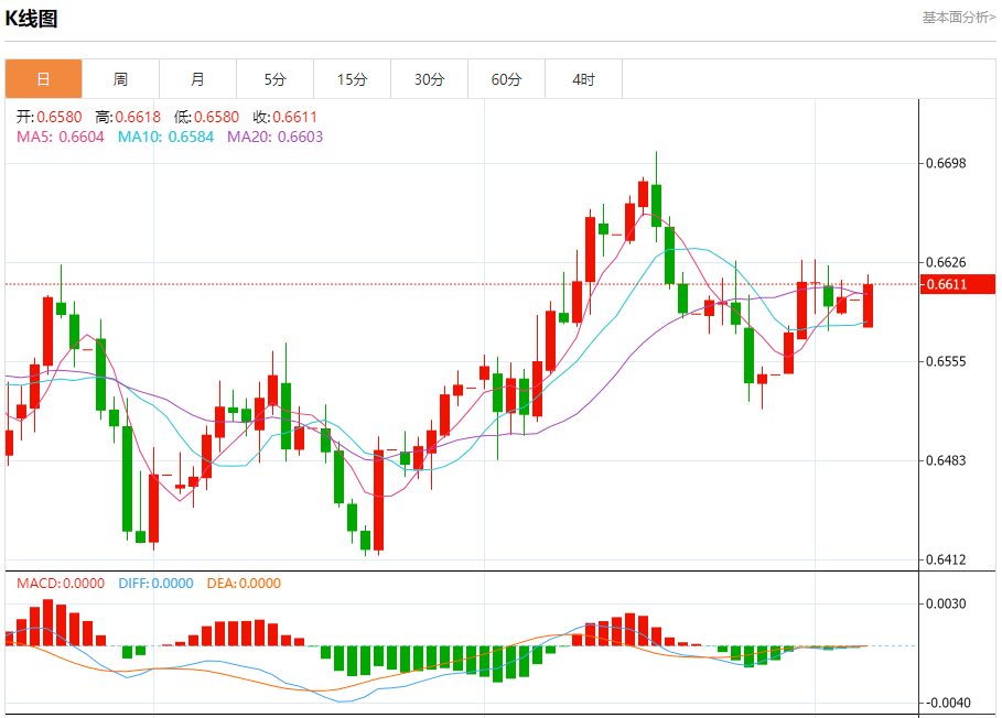 今日周一,澳元兑美元报0.6611,涨幅0.17%;美元兑加元报1.3965,涨幅0.04%;美元兑瑞郎报0.7972,涨幅0.20%。 澳元兑美元汇率分析 技术点评:RI技术指标运行趋势复杂,倾向于下降。 阻力位:0.66300.66200.6615 支撑位:0.65850.65650.6555 美元