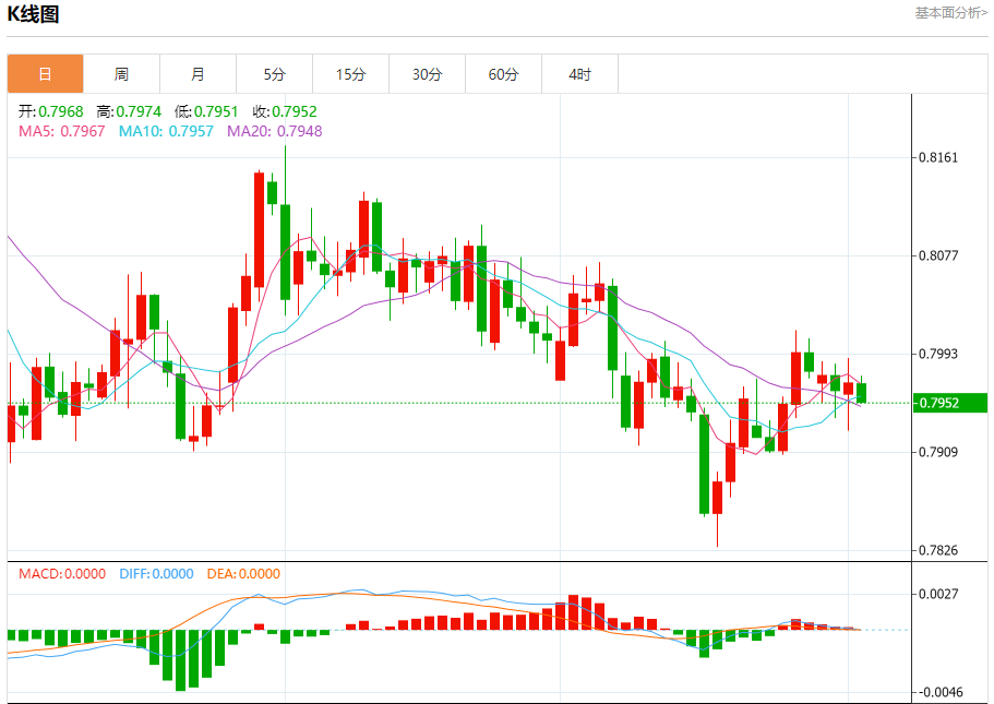 今日周四,澳元兑美元报0.6600,跌幅0.21%;美元兑加元报1.3953,涨幅0.13%;美元兑瑞郎报0.7978,涨幅0.09%。 澳元兑美元汇率分析 技术点评:超短线(当日内)技术指标缺乏动能 阻力位:0.66600.66500.6630 支撑位:0.65950.65750.6560 美元兑加