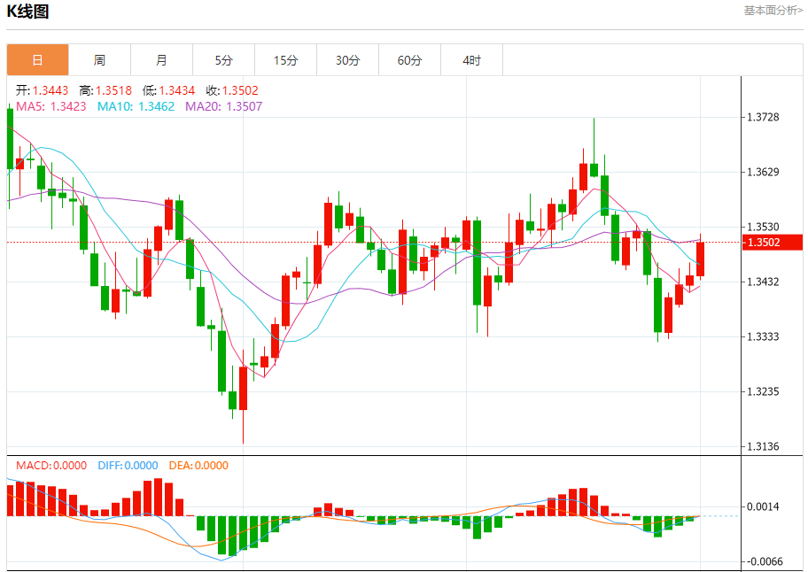 周三盘中,英镑/美元报1.3508,涨幅0.48%。 今日分析:在1.3420之上,看涨,目标价位为1.3490,然后为1.3510。 技术点评:RI技术指标向上运行。 支撑位:1.34201.33951.3375 阻力位:1.35301.35101.3490 (亚汇网编辑:冰凡)