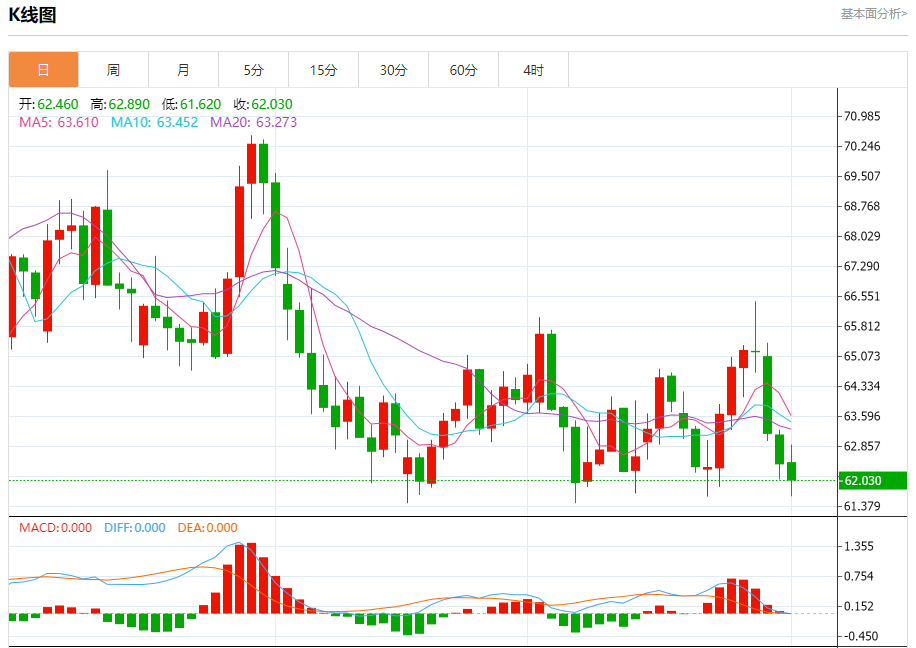 周三盘中,WTI原油报61.830,跌幅0.88%。 今日分析:在63.00之下,看跌,目标价位为61.60,然后为61.15。 技术点评:即使我们不能排除持续技术反弹的可能性,其时间长度上,应该是有限的。 支撑位:61.6061.1560.85 阻力位:64.1063.6063.00 (亚