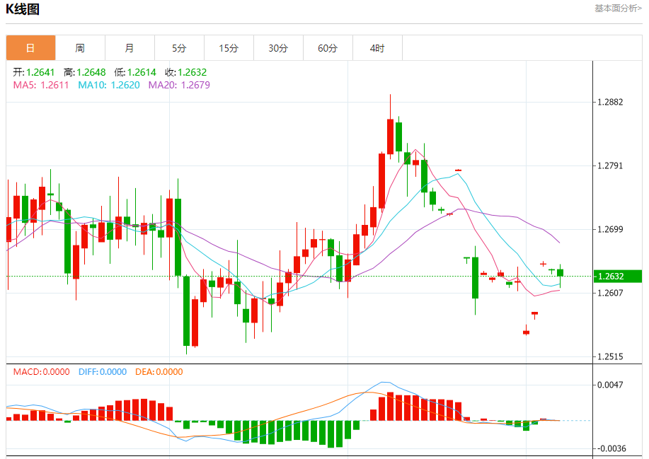 周五盘中,英镑/美元报1.2633,跌幅0.08%。 今日分析:在1.2650之下,看跌,目标价位为1.2605,然后为1.2585。 技术点评:RI技术指标运行趋势复杂,倾向于下跌。 支撑位:1.26051.25851.2565 阻力位:1.26851.26701.2650 (亚汇网编辑:冰凡)