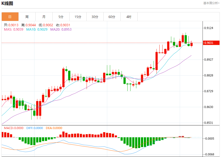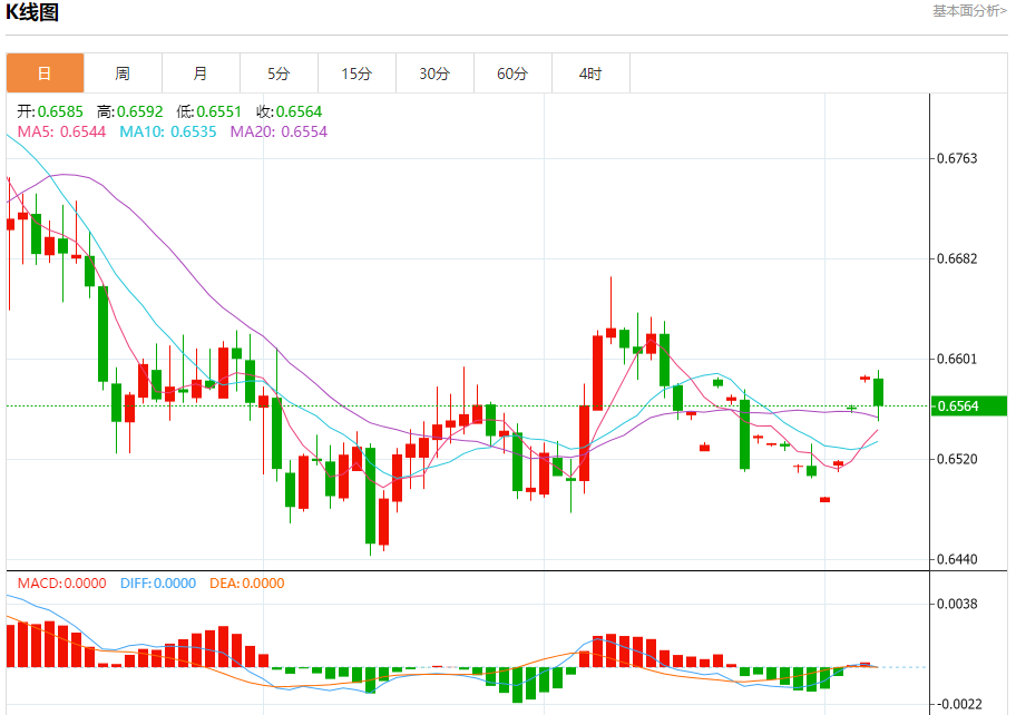 今日周五,澳元兑美元报0.6565,跌幅0.36%;美元兑加元报1.3626,涨幅0.61%;美元兑瑞郎报0.9052,涨幅0.40%。 澳元兑美元汇率分析 技术点评:RI技术指标缺乏上升动能 阻力位:0.66300.66150.6590 支撑位:0.65500.65300.6510 美元兑加元汇率分析