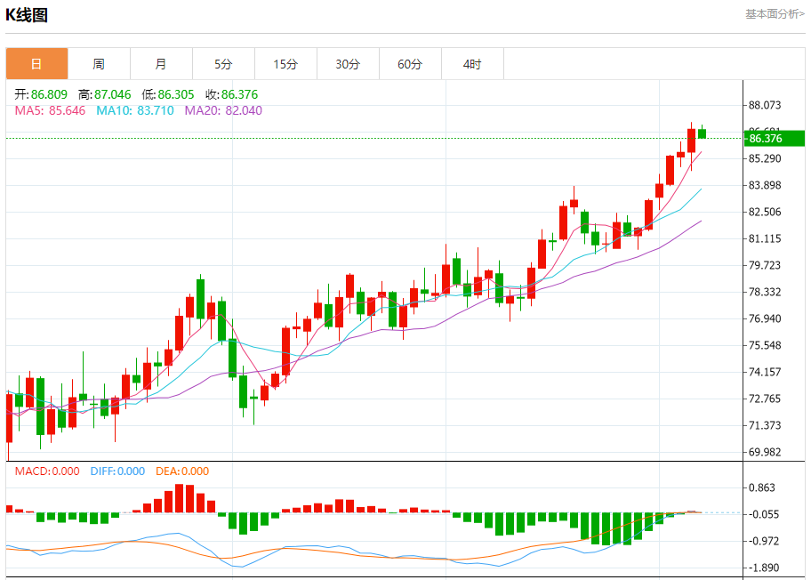 周五盘中,WTI原油报86.605,跌幅0.26%。 今日分析:在86.00之上,看涨,目标价位为87.40,然后为88.20。 技术点评:RI技术指标向上运行。 支撑位:86.0085.5084.65 阻力位:89.0088.2087.40 (亚汇网编辑:冰凡)