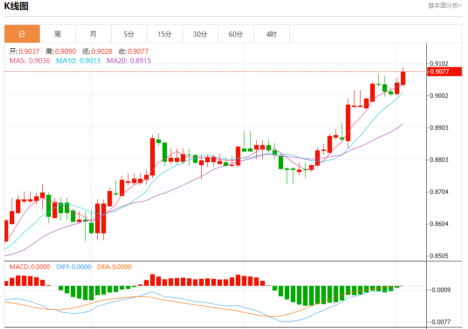 周二纽盘,瑞郎兑美元交投于0.9078,涨幅为0.38%。 瑞郎基本面分析 瑞士央行的一份工作人员报告称,该行需要花费大约270亿瑞士法郎(合300亿美元)才能将瑞郎的升值幅度控制在1.1%以下。这份报告罕见地揭示了瑞士央行官员的想法。 报告写道,央行的货币购买“有效且持久”,
