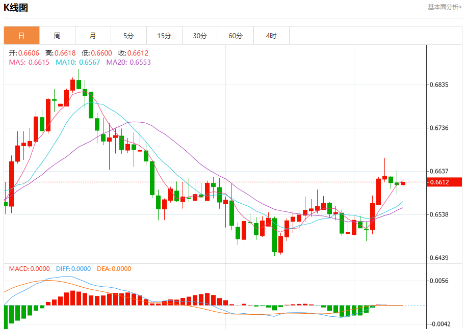 今日周三,澳元兑美元报0.6613,涨幅0.10%;美元兑加元报1.3490,跌幅0.02%;美元兑瑞郎报0.8774,涨幅0.00%。 澳元兑美元汇率分析 技术点评:RI技术指标运行趋势复杂,倾向于上涨。 阻力位:0.66500.66350.6620 支撑位:0.65900.65750.6560 美元
