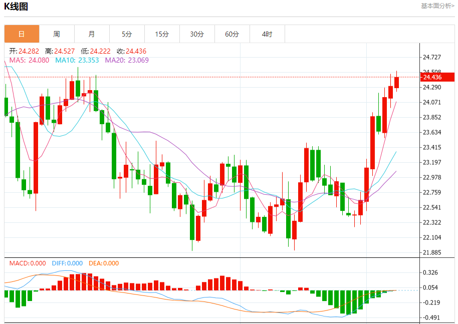 周五盘中,现货白银报24.483,涨幅0.73%。 今日分析:在24.25之上,看涨,目标价位为24.65,然后为24.85。 技术点评:RI技术指标看涨,有进一步向上趋势。 支撑位:24.2524.0023.80 阻力位:25.0024.8524.65 (亚汇网编辑:冰凡)