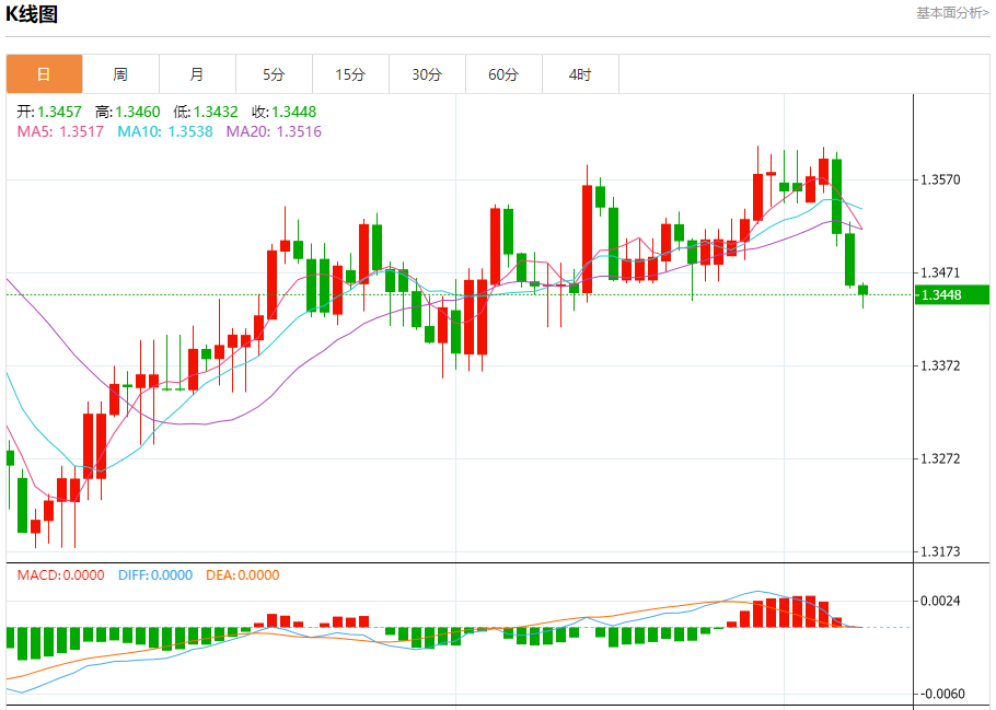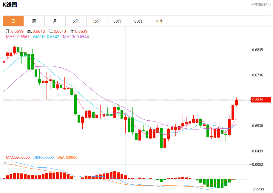 今日周五,澳元兑美元报0.6640,涨幅0.29%;美元兑加元报1.3450,跌幅0.08%;美元兑瑞郎报0.8769,跌幅0.09%。 澳元兑美元汇率分析 技术点评:RI技术指标看涨,有进一步上升空间。 阻力位:0.67000.66700.6655 支撑位:0.66250.66100.6585 美元兑