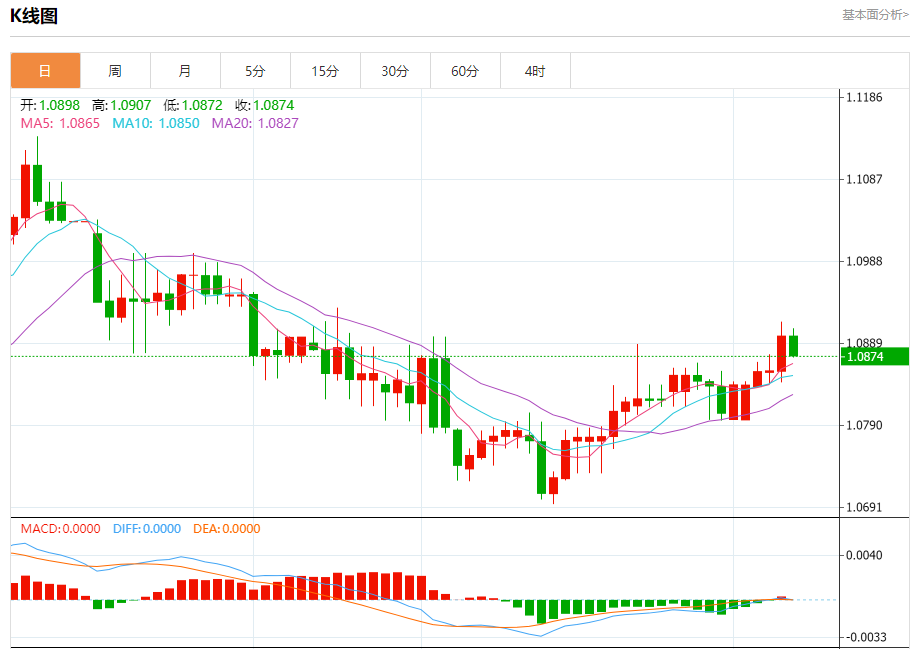 周四盘中,欧元/美元报1.0874,跌幅0.24%。 今日分析:在1.0880之上,看涨,目标价位为1.0915,然后为1.0930。 技术点评:RI技术指标运行趋势复杂,倾向于上涨。 支撑位:1.08801.08651.0850 阻力位:1.09451.09301.0915 (亚汇网编辑:冰凡)