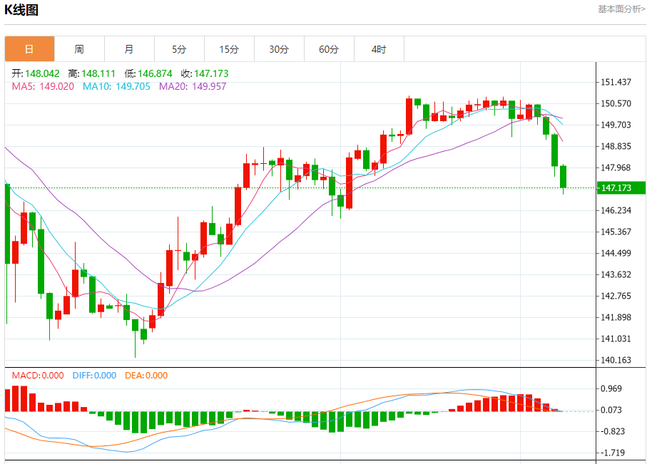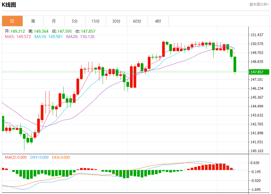 周四盘中,美元/日元报147.886,跌幅0.97%。 今日分析:在149.00之下,看跌,目标价位为147.60,然后为147.20。 技术点评:RI技术指标向下运行。 支撑位:147.60147.20146.80 阻力位:149.85149.40149.00 (亚汇网编辑:冰凡)
