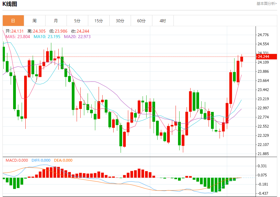 周四盘中,现货白银报24.290,涨幅0.60%。 今日分析:在23.90之上,看涨,目标价位为24.27,然后为24.40。 技术点评:RI技术指标运行趋势复杂,倾向于上升。 支撑位:23.9023.7023.55 阻力位:24.5524.4024.27 (亚汇网编辑:冰凡)