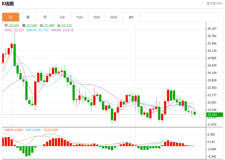 周四盘中,现货白银报22.341,跌幅0.42%。 今日分析:在22.45之下,看跌,目标价位为22.25,然后为22.16。 技术点评:跌破22.45,为空头信号,向下的目标将会是22.25。 支撑位:22.2522.1622.05 阻力位:22.7122.5622.45 (亚汇网编辑:冰凡)