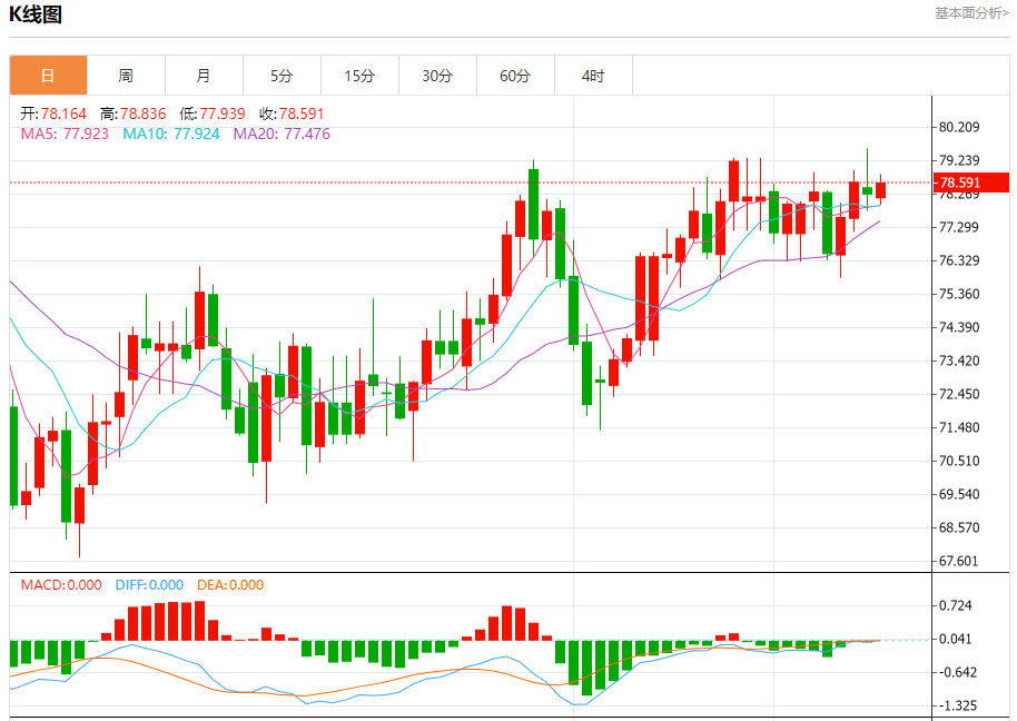 周四盘中,WTI原油报78.545,涨幅0.34%。 今日分析:在78.95之下,看跌,目标价位为77.80,然后为77.20。 技术点评:只要78.95阻力位不被突破,向下跌破77.80位置的风险很高。 支撑位:77.8077.2076.70 阻力位:80.1579.6078.95 (亚汇网编辑:冰