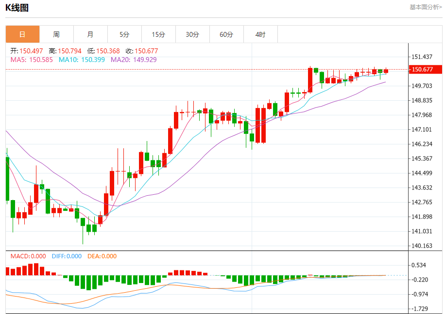 周三盘中,美元/日元报150.689,涨幅0.12%。 今日分析:在150.50之上,看涨,目标价位为150.85,然后为151.00。 技术点评:RI技术指标运行趋势复杂,倾向于上涨。 支撑位:151.20151.00150.85 阻力位:150.50150.30150.15 (亚汇网编辑:冰凡)