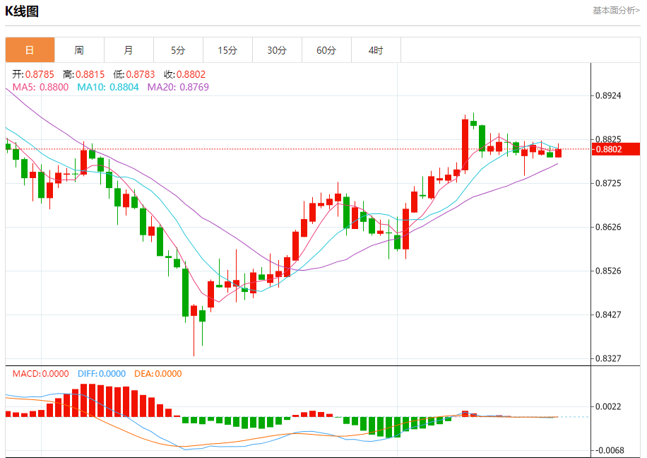 今日周三,澳元兑美元报0.6493,跌幅0.78%;美元兑加元报1.3600,涨幅0.53%;美元兑瑞郎报0.8811,涨幅0.28%。 澳元兑美元汇率分析 技术点评:RI技术指标向下运行。 阻力位:0.65650.65550.6530 支撑位:0.64800.64650.6455 美元兑加元汇率分析