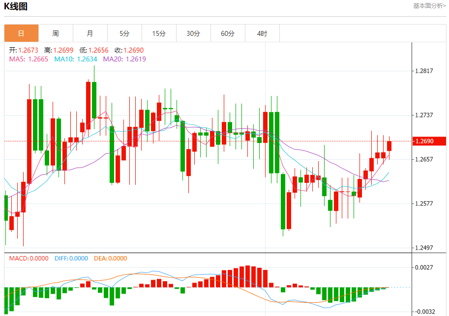 周一盘中,英镑/美元报1.2691,涨幅0.16%。 今日分析:在1.2650之上,看涨,目标价位为1.2710,然后为1.2730。 技术点评:RI技术指标向上运行。 支撑位:1.26501.26301.2610 阻力位:1.27501.27301.2710 (亚汇网编辑:冰凡)