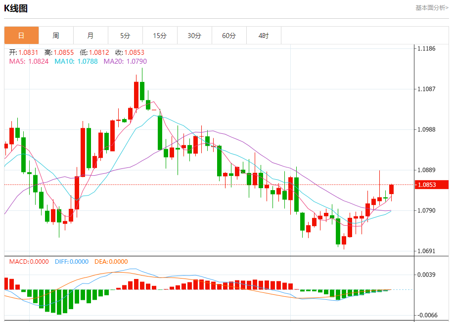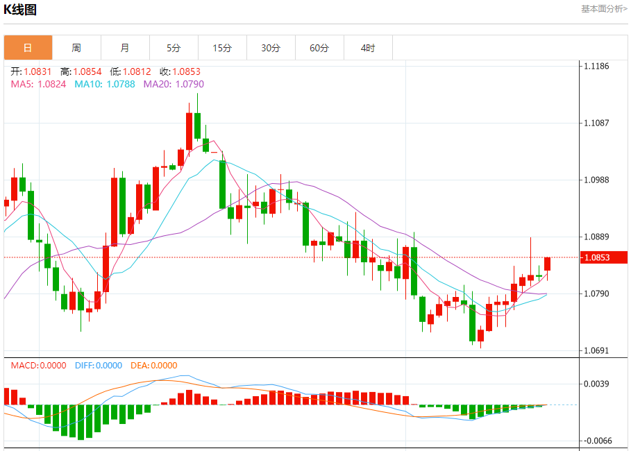 周一盘中,欧元/美元报1.0858,涨幅0.34%。 今日分析:在1.0825之上,看涨,目标价位为1.0855,然后为1.0870。 技术点评:RI技术指标向上运行。 支撑位:1.08251.08051.0790 阻力位:1.08901.08701.0855 (亚汇网编辑:冰凡)