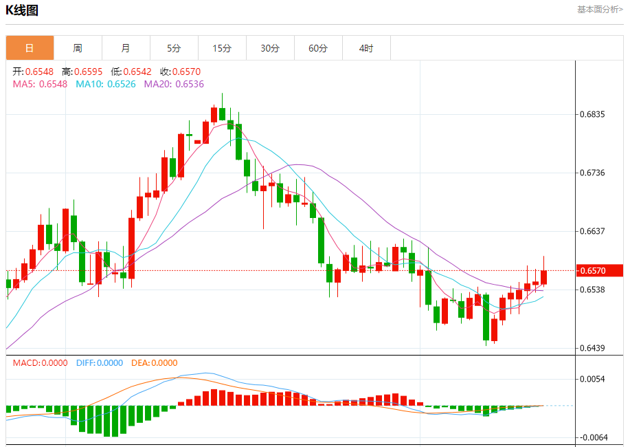 今日周四,澳元兑美元报0.6571,涨幅0.29%;美元兑加元报1.3475,跌幅0.24%;美元兑瑞郎报0.8790,跌幅0.08%。 澳元兑美元汇率分析 技术点评:RI技术指标运行趋势复杂,倾向于上涨。 阻力位:0.66250.66100.6595 支撑位:0.65600.65350.6520 美元