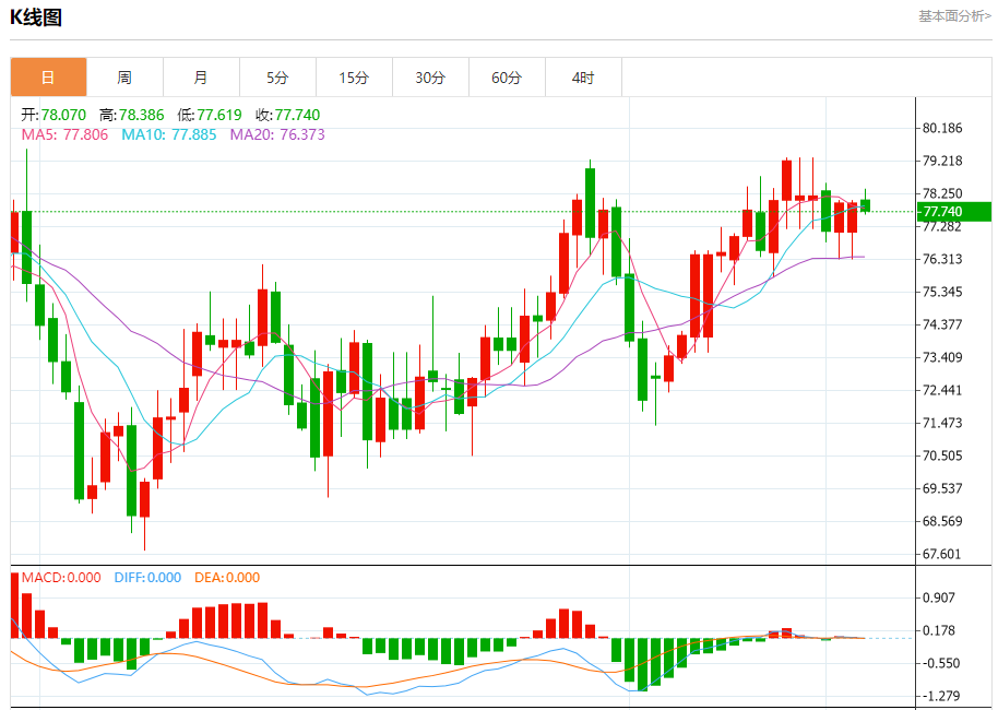 周四盘中,WTI原油报77.735,跌幅0.38%。 今日分析:在77.45之上,看涨,目标价位为78.55,然后为79.10。 技术点评:RI技术指标运行趋势复杂,倾向于上升。 支撑位:77.4576.8576.30 阻力位:80.0079.1078.55 (亚汇网编辑:冰凡)