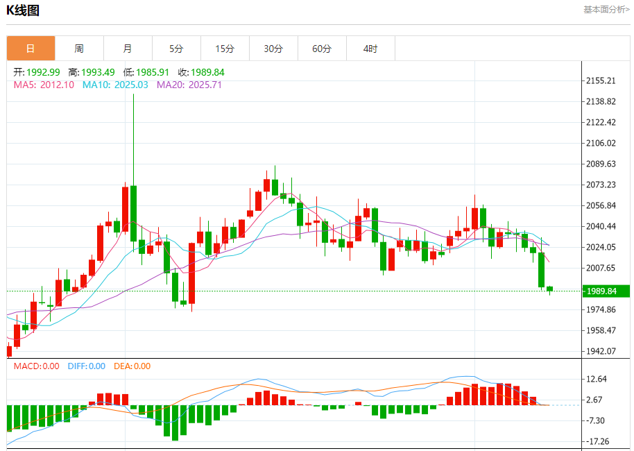 周三盘中,现货黄金报1989.85,跌幅0.15%。 今日分析:在2003.00之下,看跌,目标价位为1985.00,然后为1975.00。 技术点评:RI技术指标运行趋势复杂,倾向于下跌。 支撑位:1985.001975.001965.00 阻力位:2021.002012.002003.00 (亚汇网编辑: