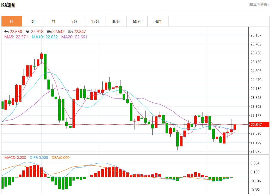 周二盘中,现货白银报22.847,涨幅0.79%。 今日分析:在22.60之上,看涨,目标价位为22.94,然后为23.07。 技术点评:RI技术指标运行趋势复杂,倾向于上涨。 支撑位:22.6022.4522.33 阻力位:23.2023.0722.94 (亚汇网编辑:冰凡)