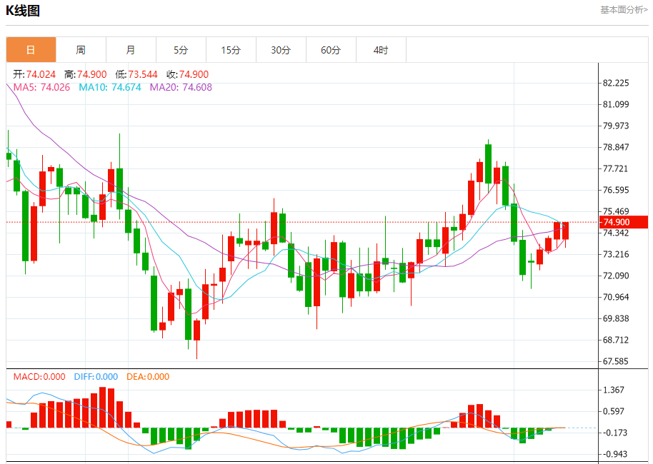 周四盘中,WTI原油报74.894,涨幅1.12%。 今日分析:在73.65之上,看涨,目标价位为75.05,然后为75.60。 技术点评:RI技术指标看涨,有进一步向上趋势。 支撑位:73.6573.3072.85 阻力位:76.8075.6075.05 (亚汇网编辑:冰凡)