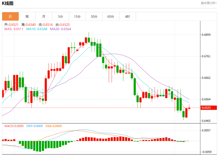 今日周三,澳元兑美元报0.6526,涨幅0.03%;美元兑加元报1.3468,跌幅0.19%;美元兑瑞郎报0.8722,涨幅0.27%。 澳元兑美元汇率分析 技术点评:RI技术指标运行趋势复杂,倾向于上涨。 阻力位:0.65700.65500.6540 支撑位:0.65050.64900.6475 美元