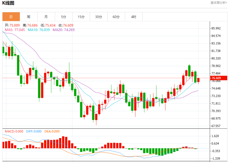 周四盘中,WTI原油报76.666,涨幅1.12%。 今日分析:在75.60之上,看涨,目标价位为77.10,然后为77.60。 技术点评:RI技术指标上,呈现上升趋势。 支撑位:75.6074.9074.50 阻力位:78.1077.6077.10 (亚汇网编辑:冰凡)