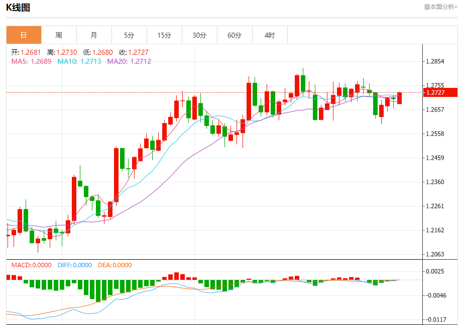 周一盘中,英镑/美元报1.2728,涨幅0.20%。 今日分析:在1.2680之上,看涨,目标价位为1.2735,然后为1.2750。 技术点评:RI技术指标向上运行。 支撑位:1.26801.26601.2645 阻力位:1.27651.27501.2735 (亚汇网编辑:冰凡)